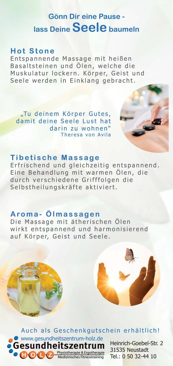 Entspannende Massage mit heißen Basaltsteinen und Ölen, welche die Muskulatur lockern. Körper, Geist und Seele werden in Einklang gebracht.